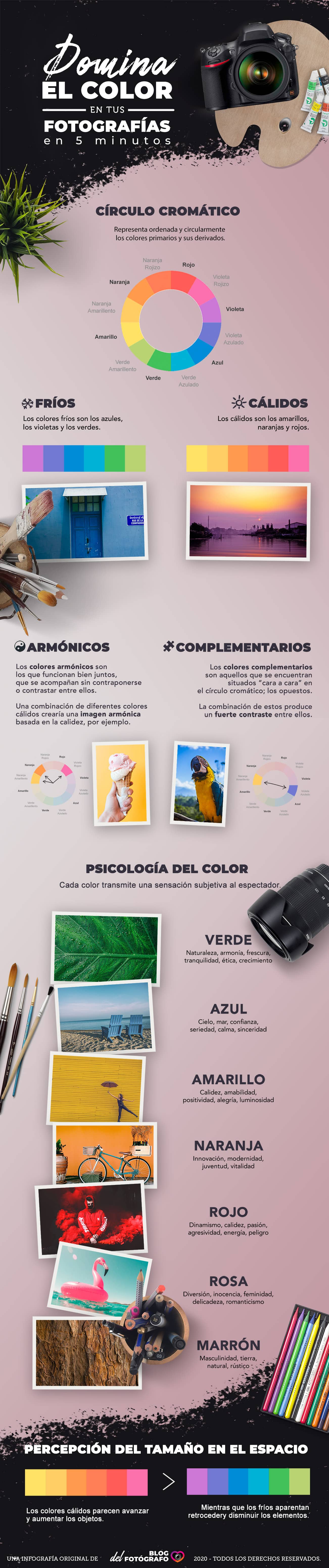 Hoy te traigo en un único documento gráfico las claves más importantes del color que, como fotógrafo, deberías contemplar a la hora de planificar tus próximas fotografías. En esta infografía del color encontrarás pistas y orientaciones respecto a qué tipo de colores deberías usar o dejar de usar para conseguir un determinado impacto en el espectador que vaya a mirar tu fotografía.