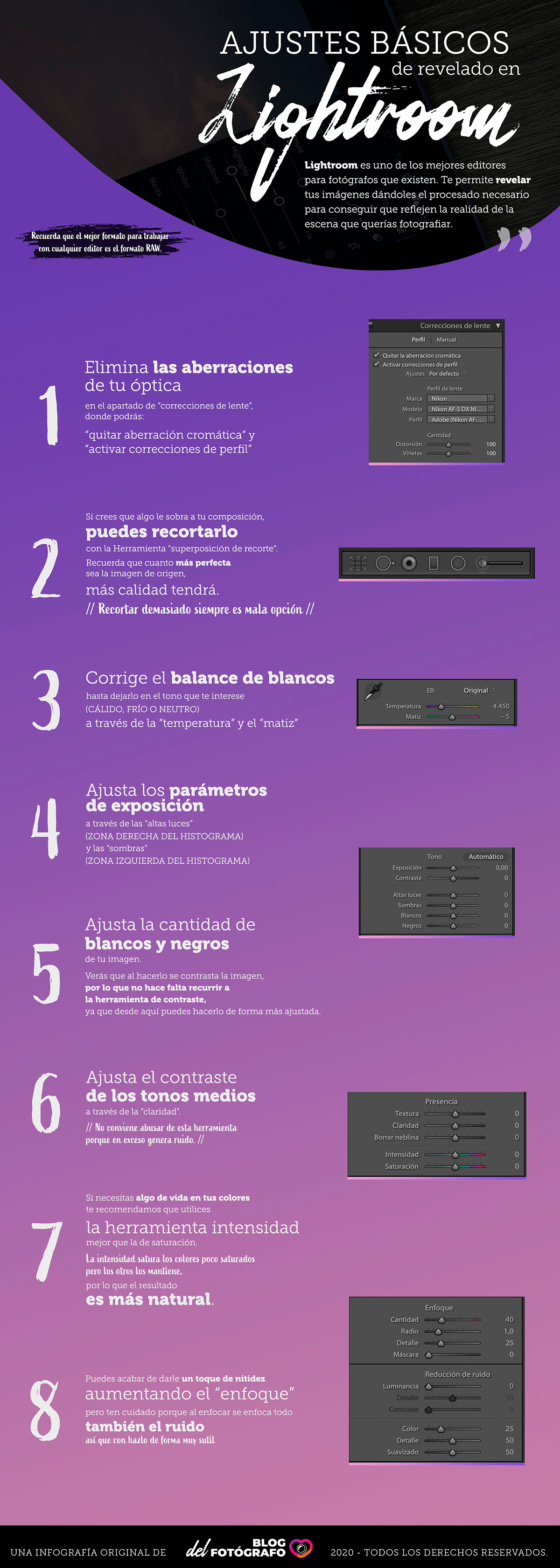 En esta infografía pretendo resumirte los ajustes básicos de revelado en Lightroom para que tus fotografías expresen lo que tú realmente quieres. Tú eres el autor de la foto y la cámara nunca sabrá mejor que tú qué es lo que deseas contar con tu imagen, o qué emociones pretendes desatar. Estos ajustes básicos te servirán para lograr imágenes de mayor impacto: