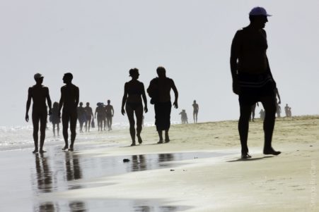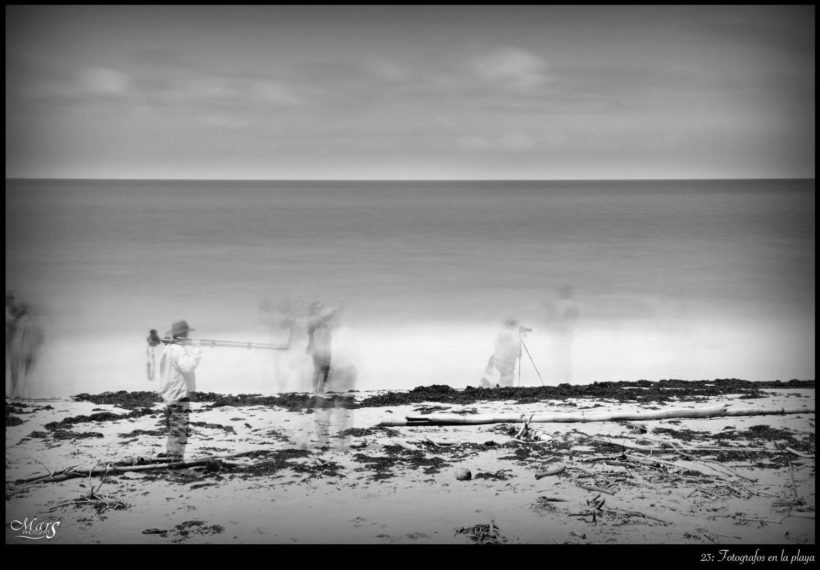 La foto elegida para inspiraros esta semana es la de Mars Photoarts, quien ha cambiado los corredores por fotógrafos. En el mismo lugar que la foto inspiradora, la playa, también en blanco y negro, ha encontrado otra forma de transmitirnos el movimiento con la larga exposición y, entiendo que, combinado con una multiexposición. Es un paisaje dividido en tres franjas: arena, agua y cielo; respetando la ley de los tercios, donde la larga exposición convierte el agua en casi una bruma y las nubes bailan etéreas en el cielo, mientras la arena y las algas permanecen imperturbables. Pintados sobre este escenario aparecen unos «fantasmas», los fotógrafos, los que llegamos y capturamos intentando no hacer ruido, pasar desapercibidos para llevarnos la belleza sin inmutar el paisaje, así nos veo yo y así percibo que los ha retratado su autor. Enhorabuena y gracias por no torcer el horizonte 😉