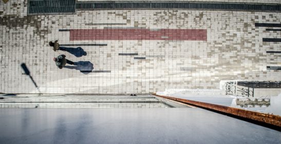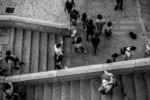 He dudado antes de elegir la foto de la semana porque el autor es el mismo que la elegida hace dos semanas, Pablo Ferrazzano. Después he pensado que no destacar su foto por eso, cuando era la que más me gustaba, no era justo. Si no pudiera elegir al mismo autor dos semanas (casi) seguidas también desmotivaría a los elegidos para no volver a participar en un tiempo, así que sí, lo más justo es elegir la foto que más me llame la atención, sea del autor que sea. En este caso se trata de «Desde mi cielo». Ha utilizado la misma perspectiva (cenital) que la foto propuesta como inspiradora, y ese es el punto fuerte de esta imagen. La distorsión de las líneas se debe a que ha utilizado un gran angular, pero se nota que ha puesto mucho cuidado en que estén lo más rectas posible. Y se agradece, pues siendo las líneas protagonistas es un punto importante. Me ha impactado la profundidad de la imagen, la sensación de caída. También me ha gustado su claridad (tengo debilidad por las fotos muy blanquitas, seguro que si nos sigues hace tiempo ya lo habrás notado ;)) y la armonía de los colores. Es una imagen que, a pesar del «vértigo» de la altura, calma. Muy acertado el incluir a los dos sujetos como centro de interés en una cuidada composición. Si te fijas, la línea de la fachada oxidada te conduce la mirada hacia ellos, como una flecha que los señala para que tu cerebro interprete dónde debe dirigir la atención. ¡Felicidades Pablo!