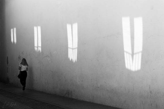 Otro fiel participante de la Inspiración Semanal y los antiguos Retos es nuestro autor de la fotografía destacada de esta semana, Nestor Maulini, esta vez con «Lluvia con onda». No sé si se ha inspirado en los patrones, las líneas o la figura caminando (corriendo en su caso), o en todo a la vez. Lo que si sé es que es una imagen muy llamativa a nivel compositivo. Los puntos fuertes son el juego de líneas curvas con las rectas; la perspectiva, pues visto desde arriba permite que este atractivo suelo quede como fondo; y el contraste de color (amarillo y rosa) con el monocromo de la calzada y el mosaico. También salta a la vista el contraste de texturas entre el asfalto y el mosaico. Tal vez la figura más a la derecha habría provocado mayor impacto, pero también es posible que hubiera pillado sobre el corte entre el negro y el blanco y no habría quedado bien. Sea como sea, es una fotografía muy interesante y que atrapa la mirada sí o sí. Felicidades Nestor y gracias por seguir compartiendo tu trabajo con nosotros.