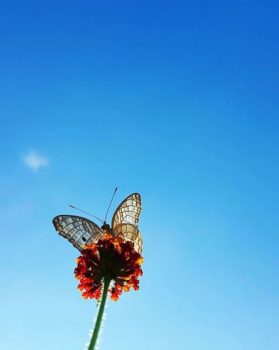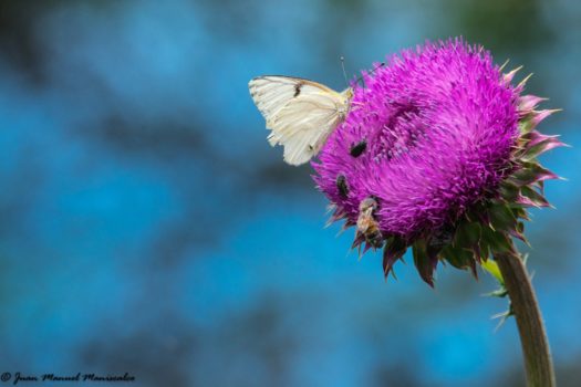 Hay varias formas de componer a través del color en fotografía, una de ellas es utilizar colores análogos o próximos en el círculo cromático para lograr armonía. Ese es el camino que ha seguido Juan M Maniscalco, autor de la fotografía destacada de esta semana. Azul en el fondo, violeta en la flor y verde en el tallo se combinan con el blanco neutro de la mariposa. No sabemos si Juan ha sabido aprovechar un fondo existente o lo ha colocado sabiamente, lo que sabemos es que el resultado es muy agradable y atractivo a la vista. El hecho de dejar espacio negativo en la parte izquierda de la imagen cede el protagonismo a la planta y la mariposa. Y, si te fijas, descubrirás las dos formas geométricas que dirigen la mirada, el círculo y el triángulo. Otro aspecto al que ha recurrido el autor para destacar el motivo es la profundidad de campo. El gran desenfoque del fondo deja claro dónde está el protagonismo y ayuda a crear el espacio negativo. ¡Enhorabuena Juan!