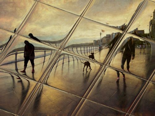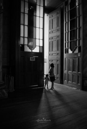 La foto de esta semana es de Ekaitzge y se titula «Donostia». Con una ejecución técnica impecable, podemos observar un claro dominio de la composición y de la luz. Me ha enamorado precisamente esta última, cómo incide directamente sobre la mujer, ambas protagonistas de la escena. Es una imagen de fuertes contrastes, de luz y oscuridad, de nuevo y viejo, de líneas rectas y suaves, de vivo e inerte. Además, el gesto de la mujer, su mirada perdida, su postura, en medio de un espacio tan abierto, frío y oscuro transmite muchísima soledad. Ajena al enorme cuadro de la pared, a la luz que la abraza, mirando a la cruz pero sin mirar… con una tristeza y un vacío enorme. Sin duda, una gran fotografía. Felicidades Ekaitzge.