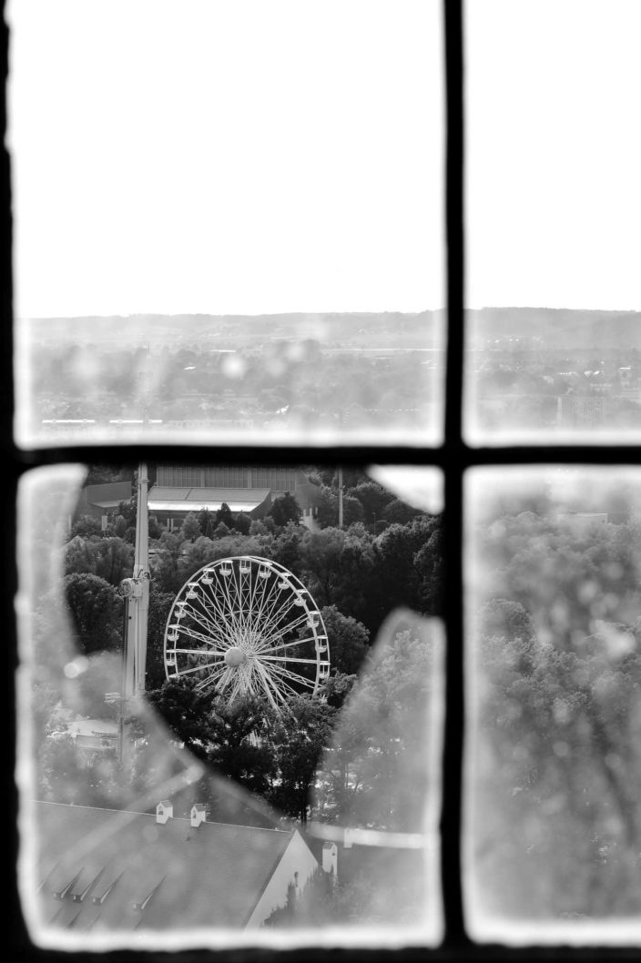 Y entre todas estas formas de narrar el paso del tiempo me quedo con la de Javier Cabañas Sanz, titulada «Hoffnung» que significa esperanza en alemán. Me ha gustado esta fotografía por su sencillez, no ha necesitado de retoques para provocar un impacto inmediato, sino que ha utilizado otros recursos compositivos (y narrativos). Lo primero es que el uso del blanco y negro es un acierto en cuanto a fotos de tiempo se refiere, es atemporal, lo mismo puede representar una foto de ayer que de hoy. Otra sabia elección ha sido la de utilizar el cristal roto que representa el pasado para encuadrar el presente, pues aunque para unos se pare, para otros sigue avanzando, como una rueda que gira. Pero es más, el encuadre natural es doble, por un lado con el cristal y por otro con el marco, por lo que hace protagonistas tanto al pasado y al presente. Ha aplicado bien la regla de los tercios para enfatizar el centro de interés y ha utilizado también otros recursos para este propósito, como el desenfoque y el espacio negativo. Las líneas también aportan atractivo y ayudan a ordenar la escena a la vez que dejan que la mirada se dé un paseo por las distintas geometrías, perfectamente reconocibles al ojo, el rectángulo, el triángulo y el círculo. También me parece muy simbólico el uso de la noria, por un lado porque gira y gira, su movimiento puede ser infinito, como el tiempo, y por otra parte, por su similitud con un reloj. Es una imagen tan sencilla como compleja, con distintas lecturas y que narra muy bien el paso del tiempo. ¡Enhorabuena, Javier!