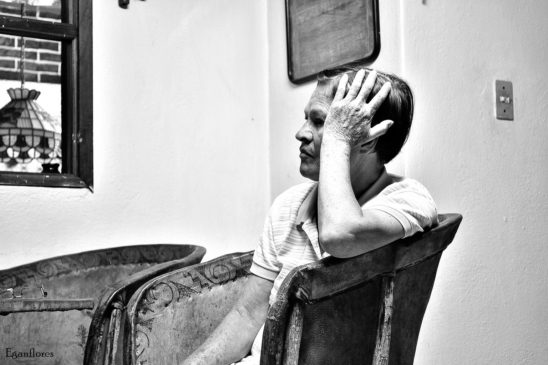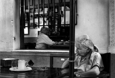 La imagen que más me ha impactado esta semana es «Angustia urbana» de Mabel Thwaites Rey y si lo ha hecho es precisamente por la angustia que transmite, tal y como el título indica. Ese es el impacto que pedía que lográrais al lanzar el reto. Una persona que sintiera el peso de la soledad no deseada. El señor que aparece al fondo de la imagen refuerza este sentimiento, pues más doloroso es sentirse solo cuando se está acompañado que estar solo por deseo. Ese aislamiento involuntario, bien por las propias barreras de uno o bien por la marginación social, es lo que provoca la angustia, la tristeza, la desesperanza y el rostro de esta mujer lo dice a gritos. Su postura encorvada, la mirada baja y perdida, el cigarro… todo su lenguaje corporal expresa angustia. Incluso las gafas sobre la mesa potencian la sensación de aislamiento, porque llega un momento en el que si no te ven, tú tampoco quieres ver, es un círculo vicioso en el que la soledad llama a la soledad, por fuera y por dentro, produciendo un desgarro interior que cada vez se hace más y más grande y te atrapa como ha quedado atrapada esta señora, en la soledad de su café y su cigarro. En la terraza, en la línea que separa el bullicio del local del suelo urbano en el que los viandantes pasan indiferentes por su lado. Y en blanco y negro, porque en la oscuridad de la soledad no existen los colores. Enhorabuena Mabel, has logrado transmitir la angustia urbana de tu título, con una gran composición y sobre todo con una buena historia para contar.