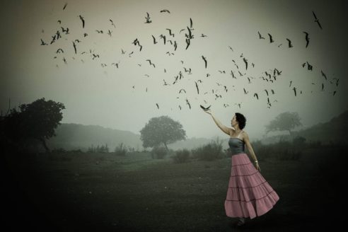 Entre todas las destacadas me quedo con la de Bea Villegas. Una imagen que me ha enamorado desde el primer instante por su magia. Una imagen ¡tan onírica! Parece sacada de un cuento, como si de un hada se tratase. Existen los encantadores de serpientes, o el Flautista de Hamelín y, a partir de esta fotografía, tengo la impresión de que siempre ha existido «el Hada de los Pájaros». En un escenario tenebroso que desprende melancolía y tristeza, su protagonista le aporta un punto de dulzura y de esperanza. La falda rosa que contrasta con la casi ausencia de color del resto te hace desviar la mirada para después volver a centrarte en la manada de pájaros. Y esa misma falda provoca la sensación de levitación, como si este hada acabara de posar su vuelo sobre la tierra o estuviera a punto de echar a volar con sus pequeñas aves. La composición es maravillosa, la edición excelente y lo mejor de todo es que para nada parece una fotografía retocada en exceso o un montaje realizado solo a base de golpe de editor. Es tan natural como irreal. ¡Felicidades, Bea, por contarnos este maravilloso cuento con una imagen como tinta!